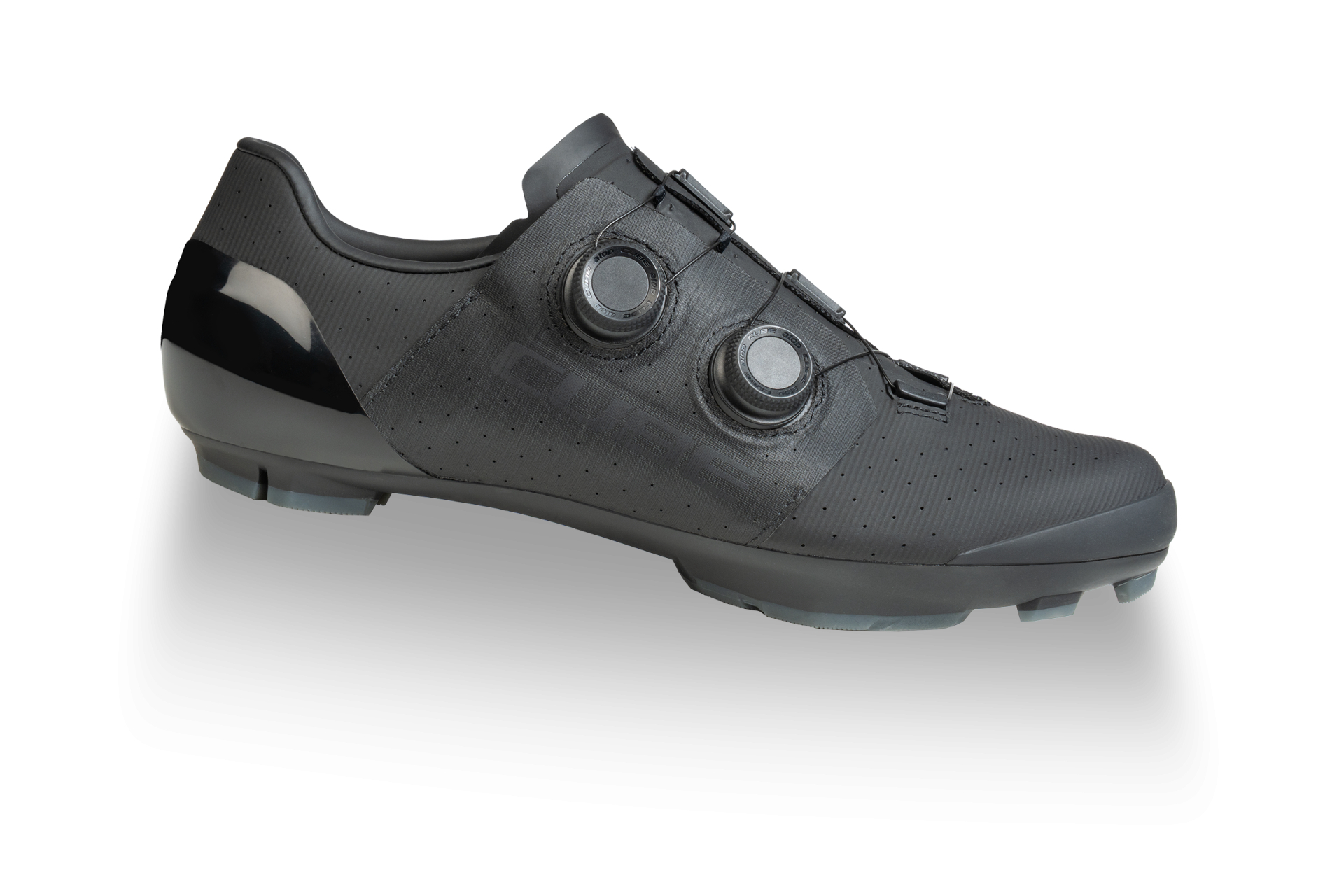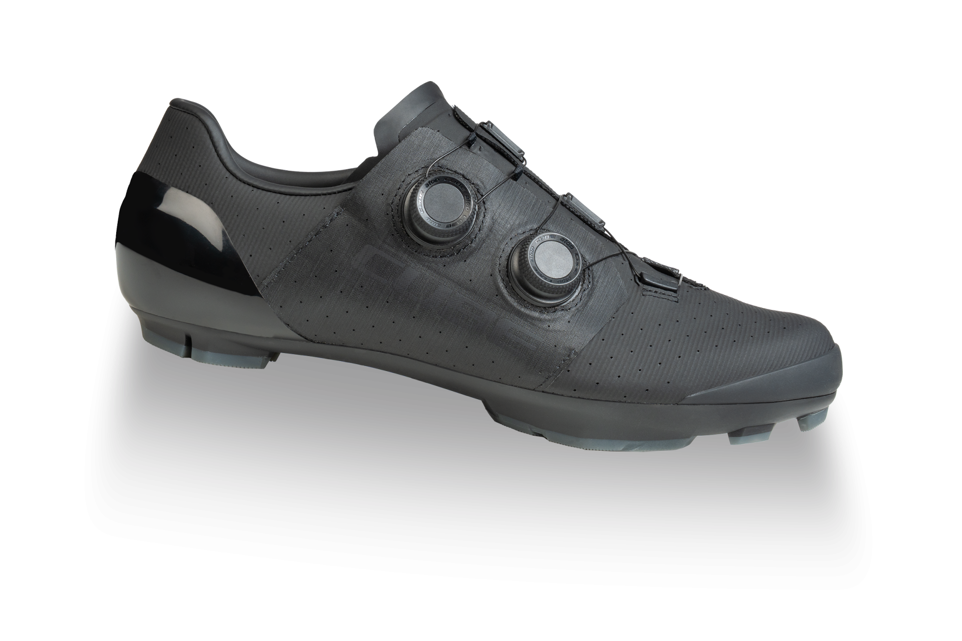 Developed with demanding marathon, cyclocross and gravel riders in mind, the CUBE MTB C:68X® shoe represents the pinnacle of off-road shoe design. Featuring a carbon fibre spine for super-efficient power delivery, the use of Peebax ® TPU also helps reduce weight by up to 20% over equivalent polymers. There's a recess for clipless pedal cleats, while the super-sticky Infinity Grip rubber tread delivers exceptional traction on pedal flats or for off-bike walking and running. With a dual disc closure for rapid entry and exit as well as secure adjustment, both the heel cap and toe box are reinforced for extra protection, and there's a knitted cuff around the entry point to prevent ingress by sticks and stones. A Dyneema ® reinforced wrap layer delivers exceptional durability to help withstand the toughest conditions, and the NF Ergonomics insole has the best possible cushioning and pressure distribution to help rider comfort.